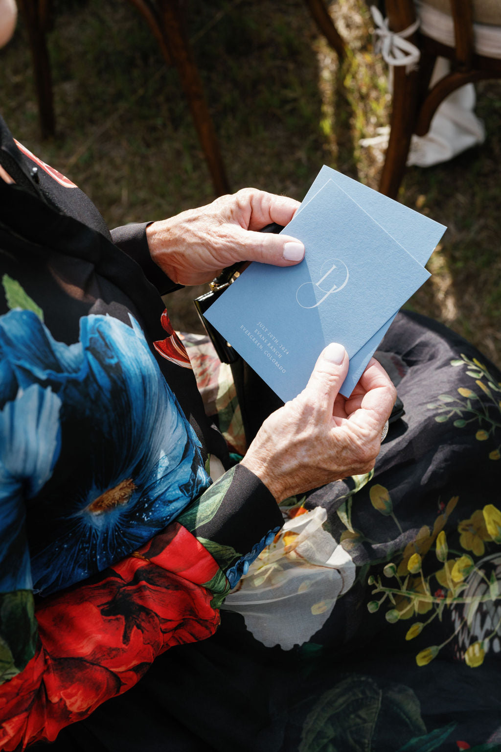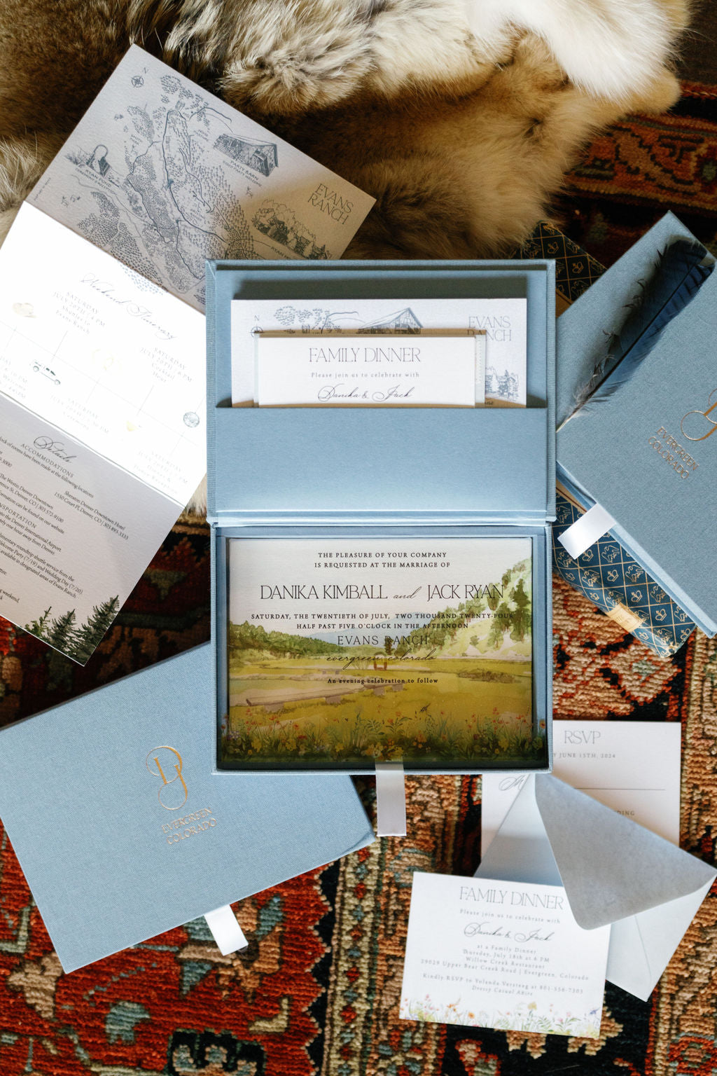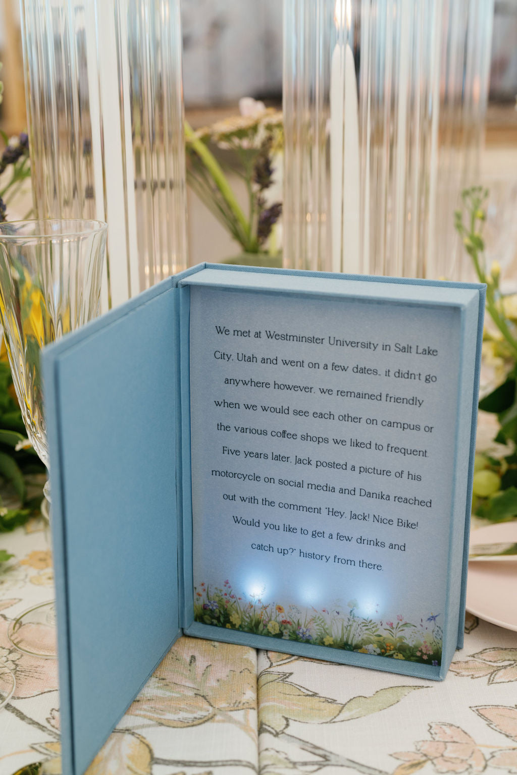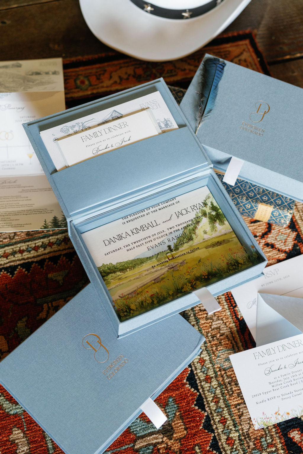 This sweet couple's wedding took place at their family ranch, where previously, the groom's sisters had their weddings. With a place that held so much meaning, it was important to honor this along with setting themselves apart from the previous celebrations. Additionally, it was important to capture their love for books and tie it in a tasteful manner. See the unboxing experience here.