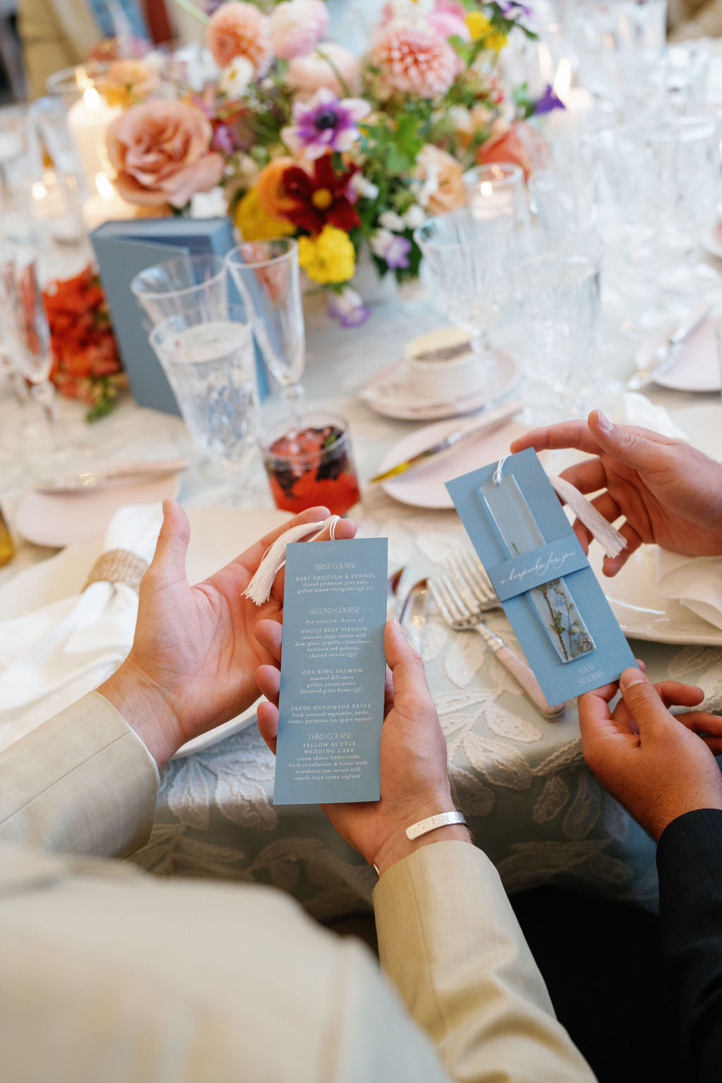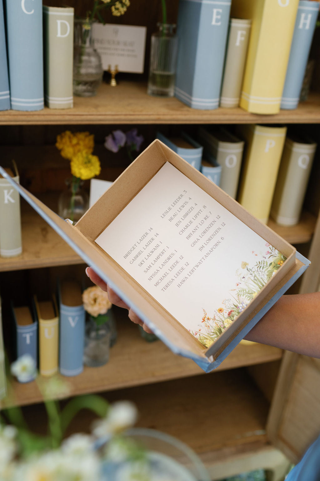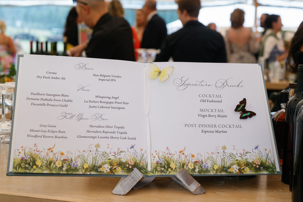 Features: Linen Boxed Invite with Gold Foil Custom Monogram, Custom Map Illustration, Custom Watercolor Venue Illustration, Experience-based Book-Theme Escort Display, Handmade Floral Resin-Poured Bookmarks as Keepsake Place Cards and Menus, Book-Themed Table Signs and Bar Menus. Disco-Cowboy Themed Bar Menus for Welcome Party, Tall Way-finding Signs for property entryways and Parking areas.