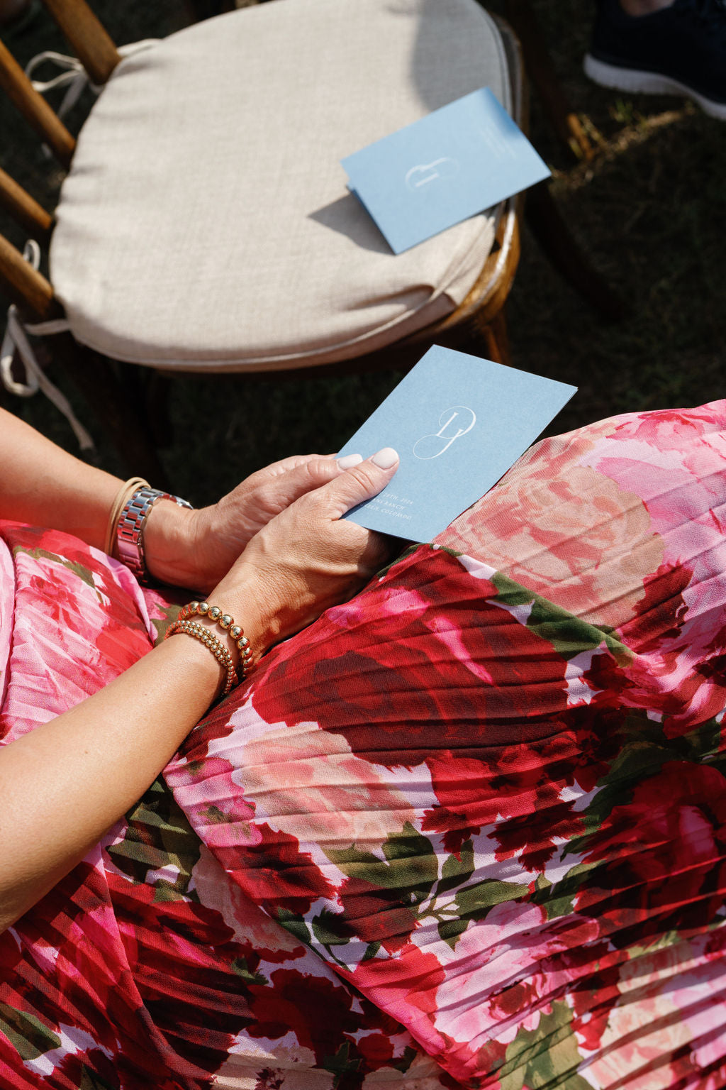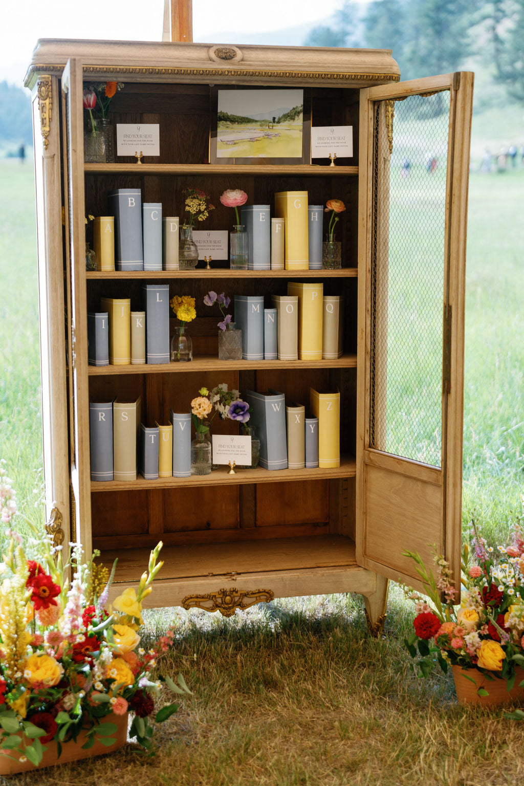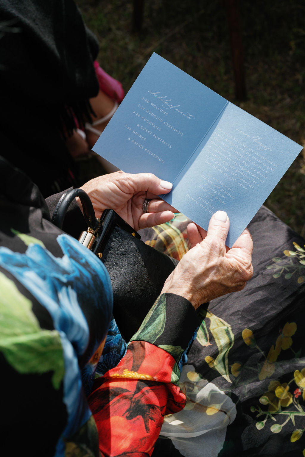 Features: Linen Boxed Invite with Gold Foil Custom Monogram, Custom Map Illustration, Custom Watercolor Venue Illustration, Experience-based Book-Theme Escort Display, Handmade Floral Resin-Poured Bookmarks as Keepsake Place Cards and Menus, Book-Themed Table Signs and Bar Menus. Disco-Cowboy Themed Bar Menus for Welcome Party, Tall Way-finding Signs for property entryways and Parking areas.