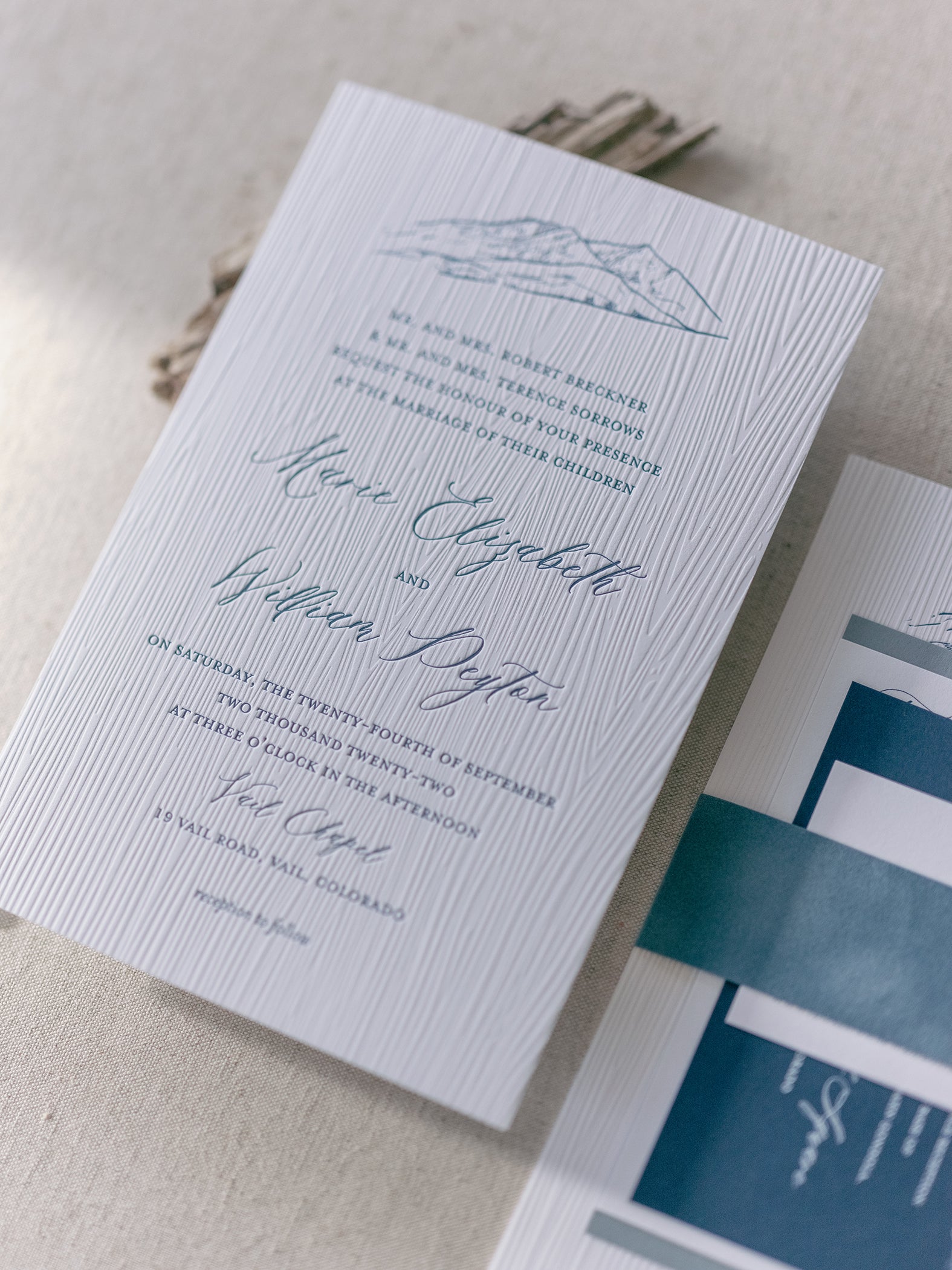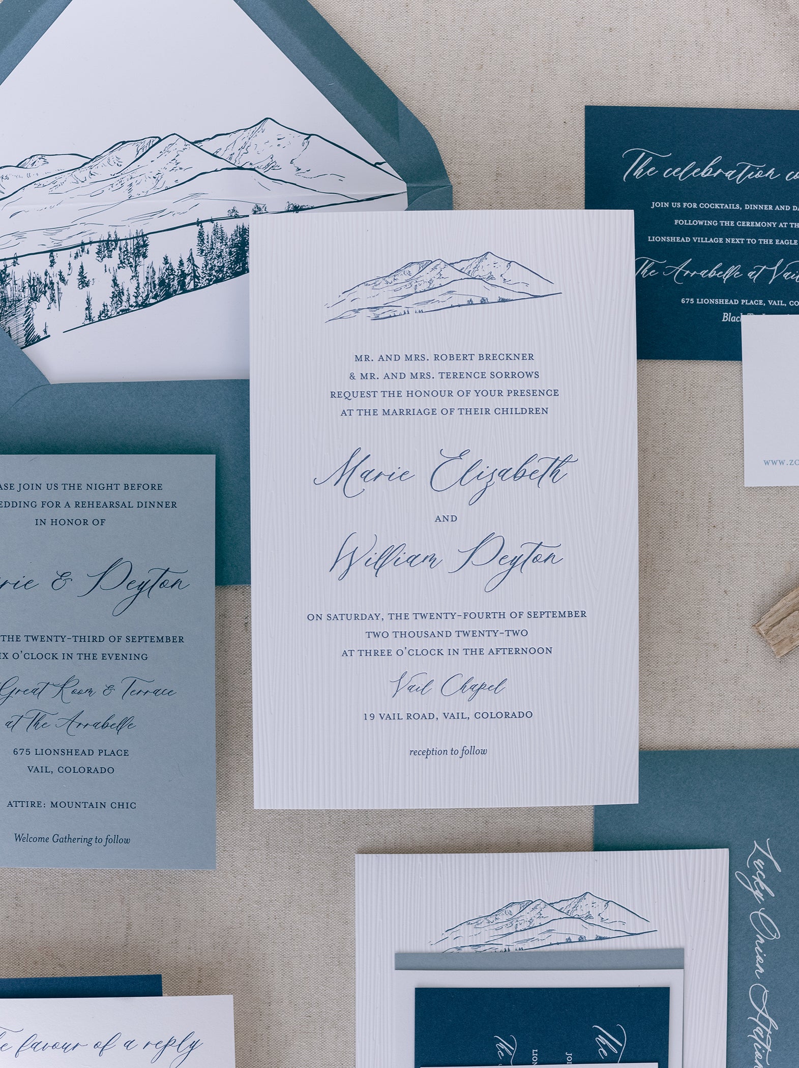Marie and Peyton wanted to incorporate a sense of connection to nature, with a touch of understated luxury. We were able to infuse this by the use of textures and the hand-drawn illustration of Vail mountains.