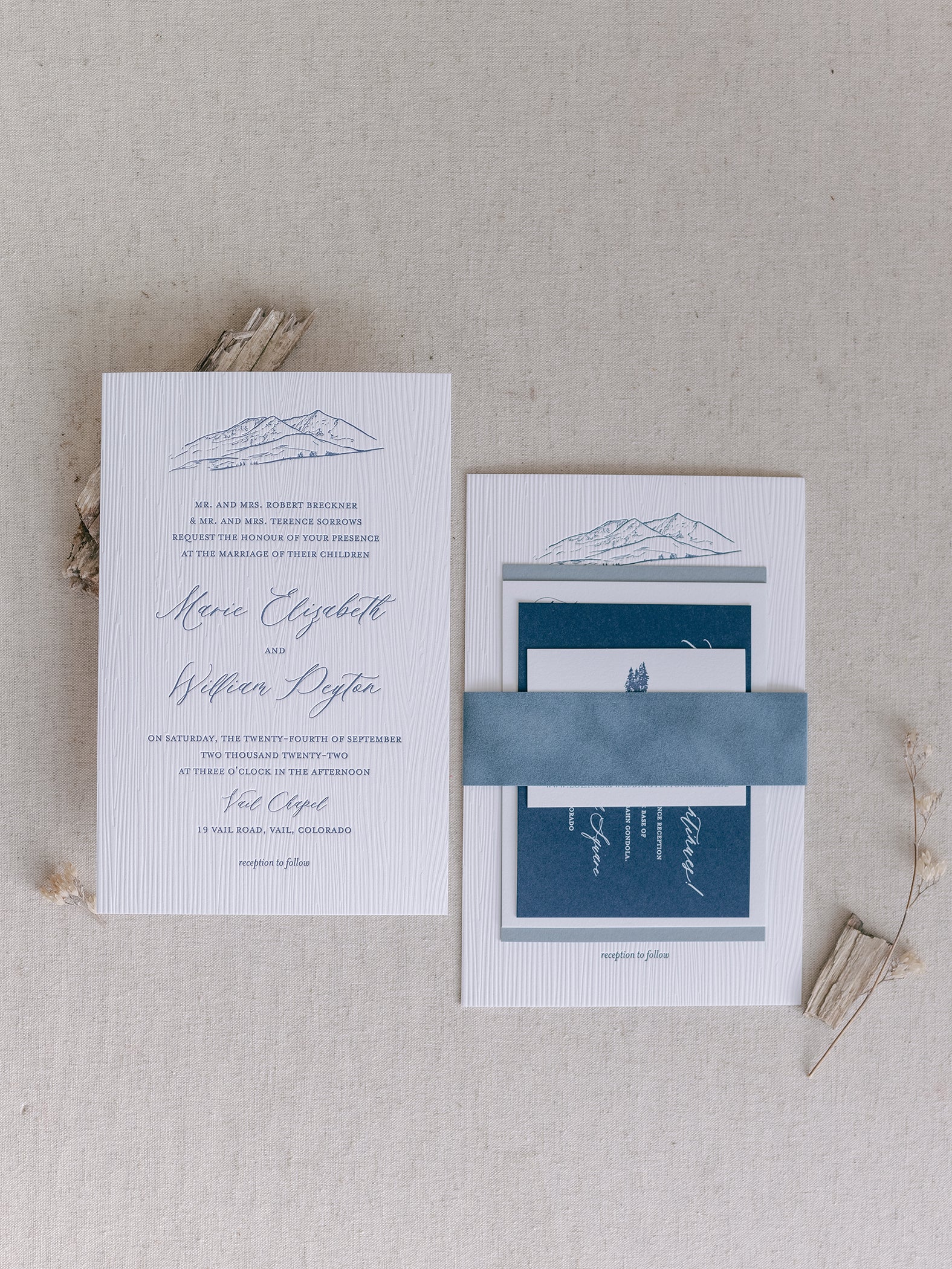 Features: Blind Letterpress Woodgrain patterning, Velvet Belly Band, Custom illustration of Vail mountains, envelope liner, and varying shades of blue